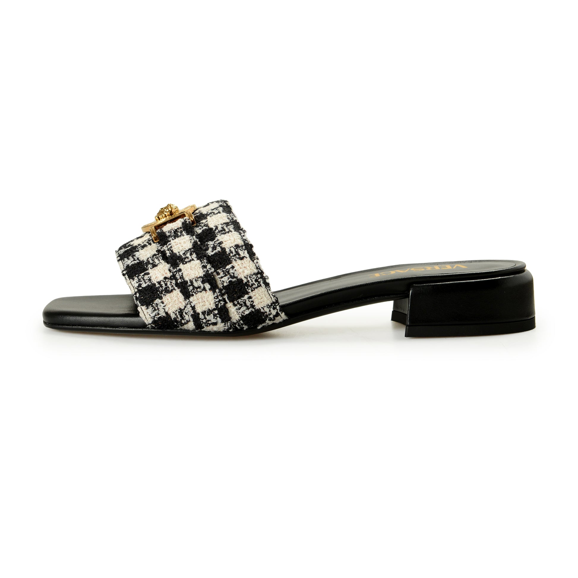 This is authentic Versace Women's Check Gold Medusa Heeled Sandals Mules Shoes